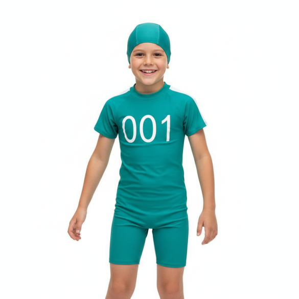 Transform your child into the iconic character from Squid Game with our Kids Squid Game 001 Swimsuit Costume. This vibrant one-piece green swimsuit, complete with a matching swimming cap, is perfect for cosplay events or summer fun. Let your little one make a splash while showcasing their favorite show in style!